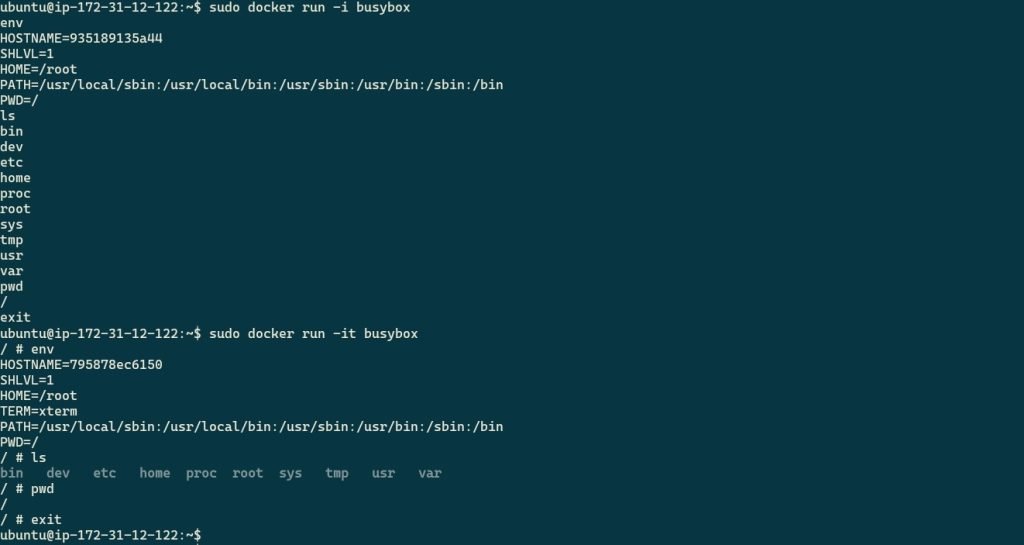 Do you wonder what will happen if you run the command with just -t option instead of -it. This will open a terminal in the container but because of missing -i (–interactive) option, the standard input on the host is not mapped to the standard input of the container. Hence the container will not recognize or process any of the commands that you will provide.